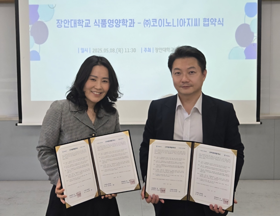 코이노니아 지씨(대표 남상효·사진 오른쪽)와 장안대학교 푸드케어과·식품영양학과(학과장 김옥선 교수)가 글로벌 식문화 인재 양성을 위한 산학협력 협약을 체결했다. 협약식은 지난 8일 장안대학교에서 열렸다.