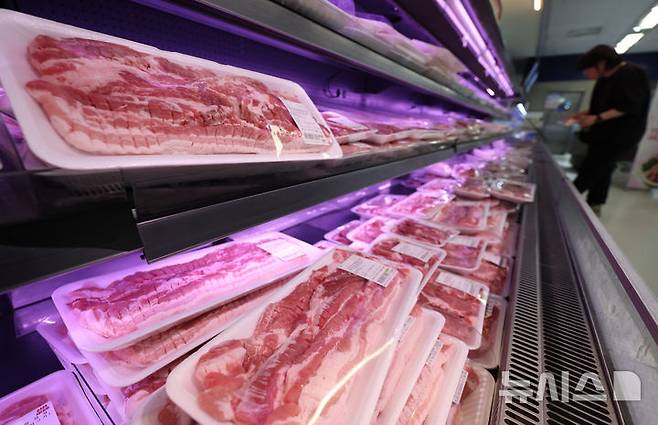 [서울=뉴시스] 김진아 기자 = 계란, 돼지고기 등 일부 축산물을 중심으로 한 먹거리 물가가 불안이 이어지고 있다. 지난달 하순 기준 국내산 냉장 삼겹살 평균 소비자가격은 100g당 2446원으로 전년 동기(2368원)대비 3.3% 상승했다. 목살도 같은 기간 2209원에서 2242원으로 1.5% 올랐다. 사진은 13일 서울 시내의 한 대형마트에 진열된 돼지고기. 2025.05.13. bluesoda@newsis.com