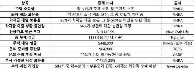 은퇴 준비도 불안하다. X세대의 평균 은퇴자금은 권장액에 한참 못 미치며, 48%가 “노후자금이 부족할 것”이라고 답했다. 미국 사회보장기금 고갈 시점(2033년)이 X세대 은퇴와 겹치면서 연금 삭감 우려도 크다.