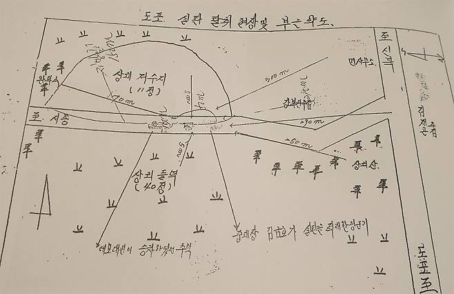| ▲ 영암 도포 실탄 탈취 현장 부근 약도. 당시 수사팀이 박재택 등을 조사하면서 그린 것이다. |