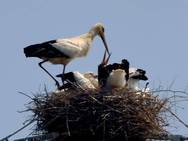 어미 황새 한 마리가 새끼 네 마리를 키우는 듯한 모습이었다.