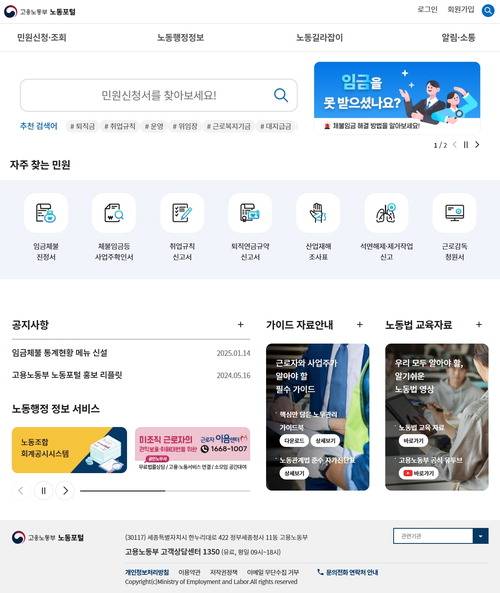 노동포털은 국민이 온라인·모바일을 통해 언제, 어디서든 노동행정 서비스를 편리하게 이용할 수 있도록 구축한 전용 포털이다.