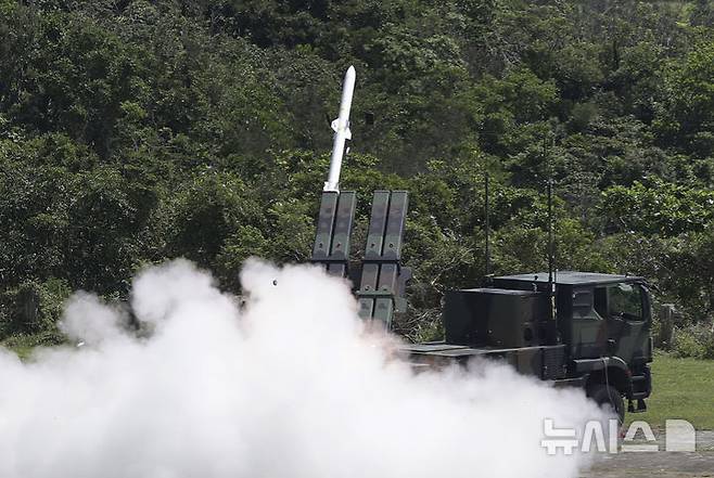 [핑둥=AP/뉴시스] 13일(현지 시간) 대만 남부 핑둥현에서 대만군이 ‘톈첸 II'(TC-2) 지대공 미사일을 시험 발사하고 있다. 2025.05.13.