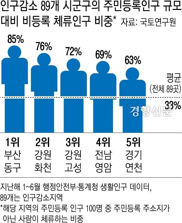 부산 동구의 경우 체류인구 비중이 85%에 달했다. 동구의 주민등록인구가 100명이라면, 주민등록 없이 이 지역에서 주로 생활하는 인구도 85명이나 된다는 뜻이다.
