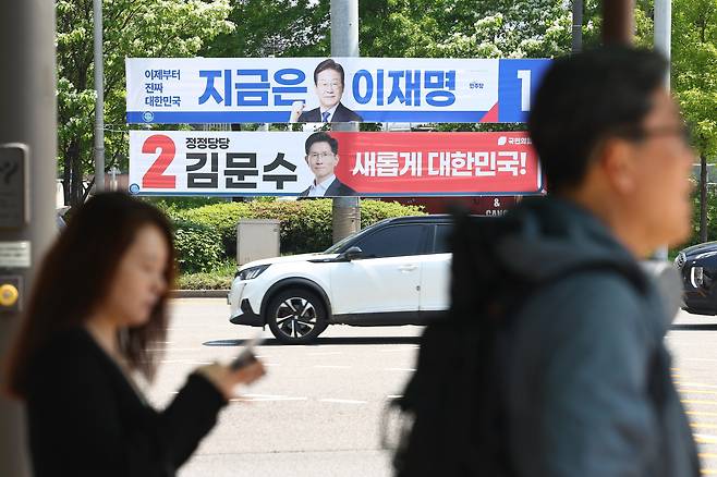 | ▲ 제21대 대통령 선거를 22일 앞두고 공식 선거운동이 시작된 12일 서울 서초구 서울고속버스터미널 역 인근에 더불어민주당 이재명 후보와 국민의힘 김문수 후보의 현수막이 걸려 있다. |