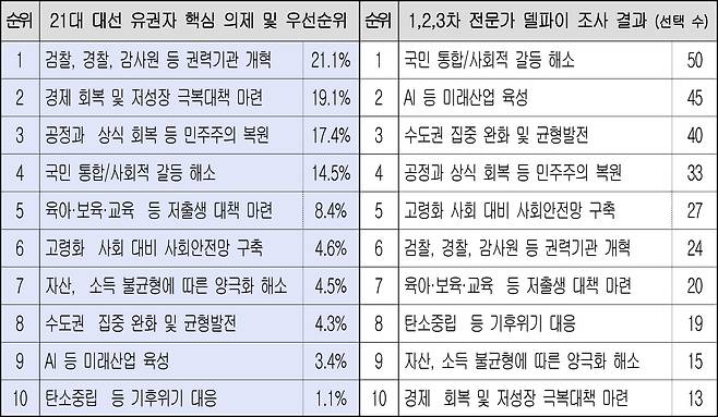 | ▲ 21대 대선 유권자 10대 핵심의제 및 전문가 델파이 조사 결과 |