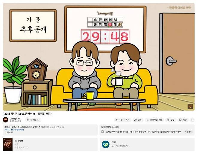 엔씨소프트(공동대표 김택진, 박병무 이하 엔씨)는 자사의 MMORPG ‘리니지M’의 라이브 방송 ‘스탠바이M - 홈커밍 데이’가 방송 당일 15만 조회수를 돌파하며 게임 인기 급상승 동영상 1위에 올랐다고 13일 밝혔다.