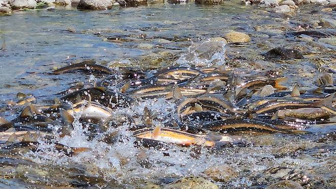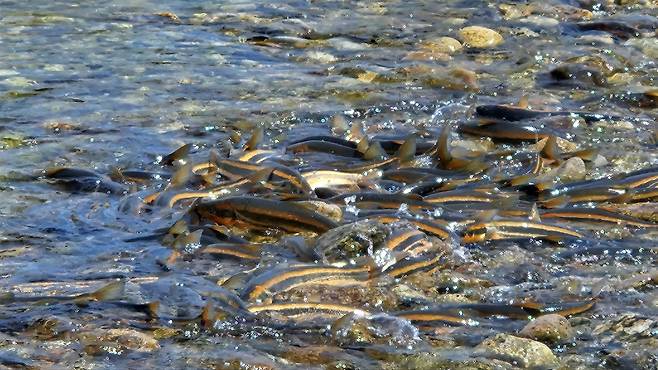 남대천에 돌아온 봄의 손님, 황어. 이들의 신비로운 생명의 여정이 지속될 수 있도록 모두의 관심과 노력이 필요하다.