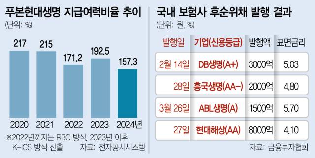 지난해 말 기준 푸본현대생명의 재무 건전성을 나타내는 지급여력(K-ICS)비율은 157.3%로 전년(192.5%) 대비 35.2%포인트 떨어졌다. 만약 650억 원을 모두 현금으로 상환한다고 가정하면 지난해 말 재무제표 기준으로 킥스 비율은 150.4%까지 떨어진다. 금융 당국이 조기상환을 허용하고 있는 킥스 비율 기준치 150%를 겨우 넘기는 수준이다. 올 후순위채 콜옵션을 맞는 국내 보험사 중 킥스 비율이 150%에 근접한 건 푸본현대생명이 유일하다.