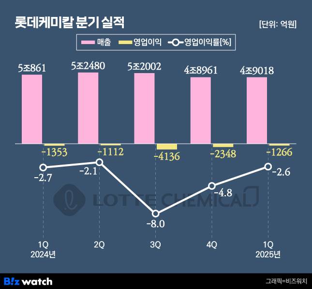 롯데케미칼은 지난 1분기 연결기준 매출 4조9018억원, 영업손실 1266억원을 기록했다고 13일 공시했다. 매출은 지난해 1분기 5조861억원과 비교해 3.6% 줄었지만 같은기간 영업손실 규모는 1353억원에서 소폭 개선되는 흐름을 보였다.