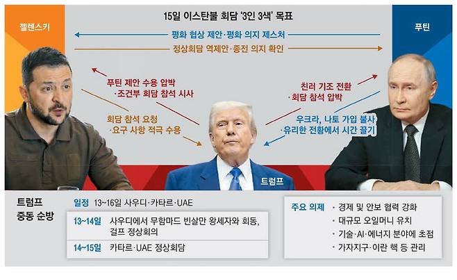 이런 상황에서 볼로디미르 젤렌스키 우크라이나 대통령이 트럼프 대통령에게 15일 튀르키예 이스탄불에 와 줄 것을 요청했다. 블라디미르 푸틴 러시아 대통령이 이스탄불 평화 회담을 제안하자 정상회담을 역제안한 젤렌스키 대통령이 트럼프 대통령을 초청한 것이다.