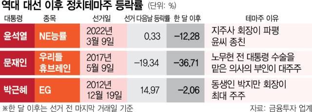 이 종목들은 친소 관계에 따라 테마주로 분류됐다. NE능률은 모회사인 HY의 윤호중 회장이 윤 전 대통령과 같은 파평 윤씨 종친이라는 이유에서 테마주로 꼽혔다. 우리들휴브레인의 경우 노무현 전 대통령의 허리 디스크 수술을 맡은 이상호 우리들병원장의 부인 김수경 씨가 대주주로 알려지면서 유명세를 탔다. EG는 박 전 대통령의 동생인 박지만 회장이 최대주주로 있어 부각됐다.