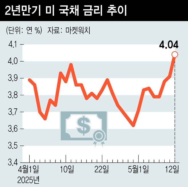 연준의 통화정책 전망을 잘 반영하는 2년만기 국채 금리가 전날보다 0.07%포인트 오르며(채권값은 하락) 연 4.01%에 거래를 마친 것이 눈길을 끈다. 트럼프 대통령이 상호관세를 발표한 4월2일(3.86%) 이후 하락세가 더 가팔라졌던 금리가 4%대로 다시 올라섰다. 연준이 기준금리를 동결하고 향후 금리 인하에 계속 신중하겠다는 뜻을 내비친 7일 이후 상승폭이 0.25%포인트다. 10년만기 미 국채금리도 연 4.37%로 0.08%포인트 올랐다.