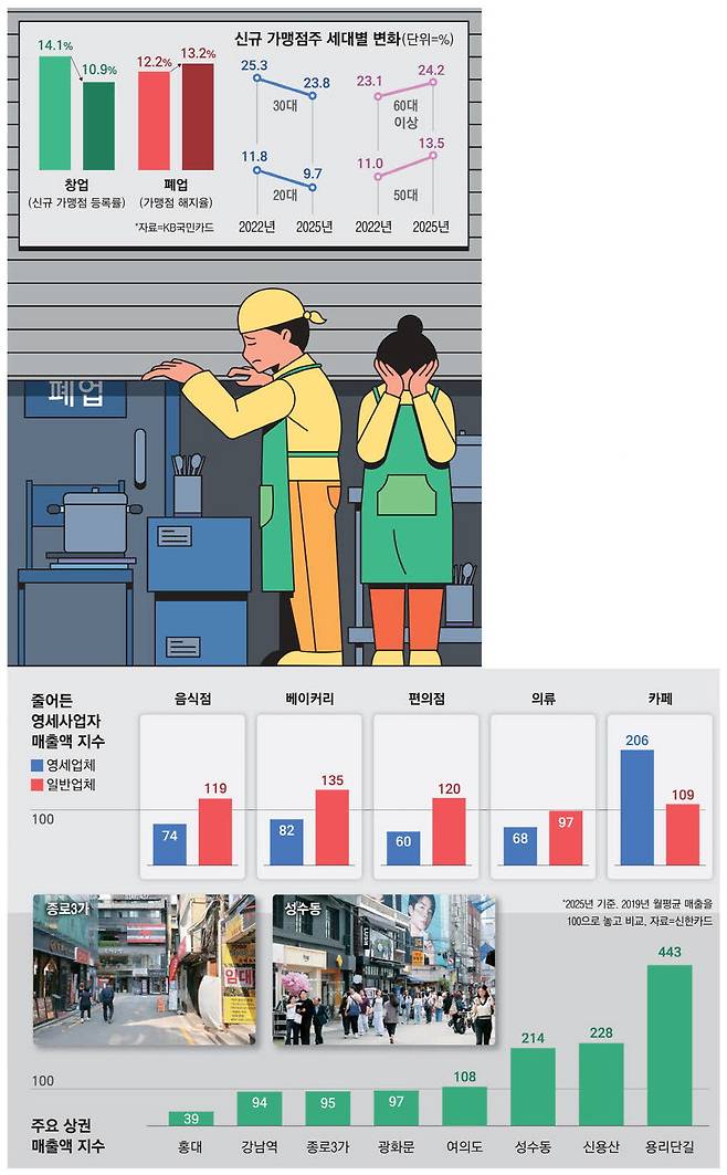 특히 모든 자영업자가 어려웠던 코로나19 때와 달리 최근에는 영세사업자의 매출이 더 빠르게 감소하는 것도 소규모로 시작하는 젊은 층 자영업자의 폐업을 부채질하고 있다. 5060세대에 비해 젊은 층의 자본력이 부족하기 때문이다.