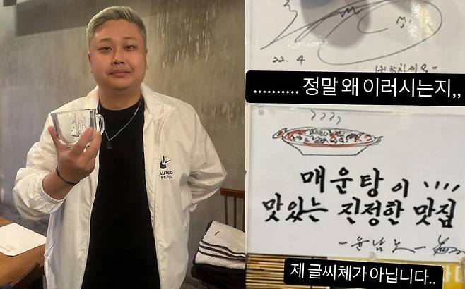 공개된 사진엔 모 식당에 붙은 윤 셰프의 사인과 '매운탕이 맛있는 진정한 맛집'이라는 멘트가 담겼다. 윤 셰프는 "내 글씨체가 아니다"라고 강조하며 해당 사인이 조작된 것임을 알렸다.