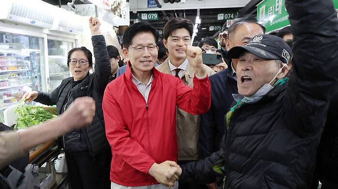 ▲ 제21대 대통령 선거 공식 선거운동 첫날인 12일 국민의힘 김문수 대선 후보가 서울 송파구 가락시장을 찾아 상인들과 인사하고 있다.