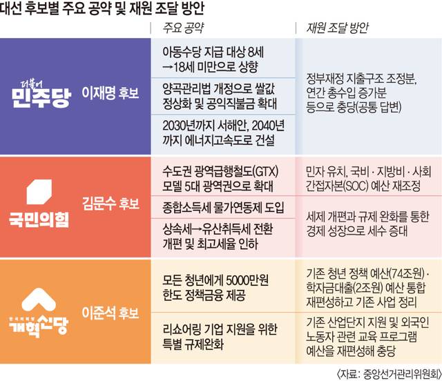 대선 레이스 개막에 맞춰 주요 후보들이 대규모 재정 지출과 감세 정책이 담긴 10대 공약을 발표했지만 재원 조달책은 구호 수준이다. 더불어민주당과 국민의힘 거대 양당은 ‘총수입 증가분으로 충당’ ‘민자 유치’ 등 두루뭉술하게 재원을 조달하겠다고 밝혀 상대적으로 자세한 대책을 내놓은 개혁신당에 비해 책임감이 부족하다는 지적이 나온다.
