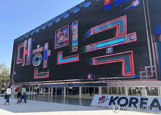 (오사카=연합뉴스) 김예나 기자 = 13일 일본 오사카·간사이 만국박람회(오사카 엑스포) 한국관 앞에 설치된 대형 화면 모습. 2025.5.13
