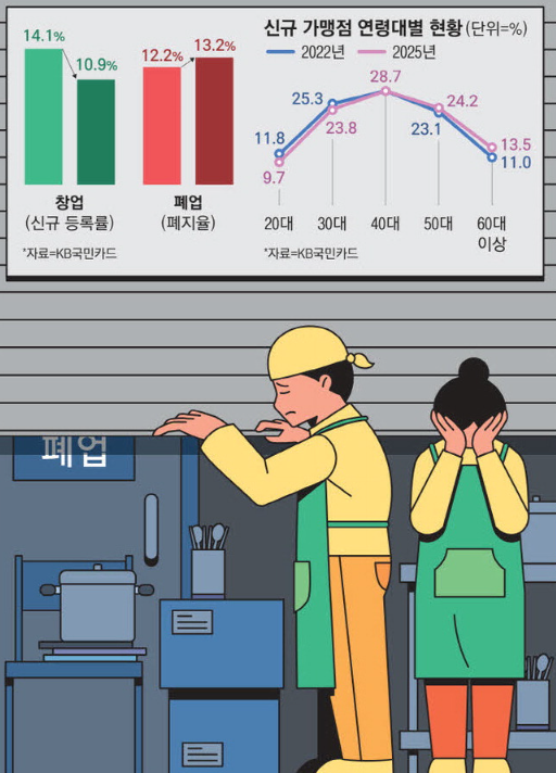 13일 KB국민카드의 유효가맹점 현황 분석 데이터에서는 청년 자영업자가 줄어드는 반면 퇴직 후 자영업에 뛰어드는 중장년층은 늘어나는 경향이 확인됐다.