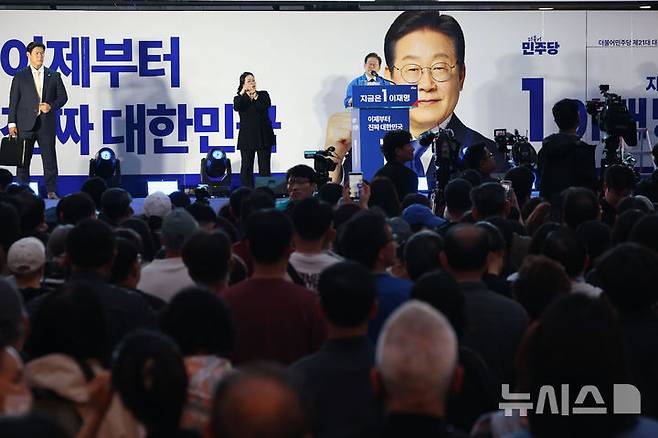 [울산=뉴시스] 권창회 기자 = 이재명 더불어민주당 대선 후보가 13일 울산 남구 롯데백화점 울산점 광장에서 열린 유세에서 지지호소를 하고 있다. 2025.05.13. kch0523@newsis.com