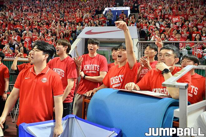 창원에서 열렸던 챔피언결정전 4차전 영상을 다시 보면 서울 SK 벤치 근처에서 깨알 같은 변화가 있었던 걸 알 수 있다. 김지후, 선상혁, 전성환 등 D리그 멤버도 전원 현장을 찾았다. 이들 역시 SK가 팬들에게 배포하기 위해 제작한 붉은 티셔츠를 입고 선수들에게 힘을 실어줬다. 3차전이 열렸던 날은 용인에 있는 연습체육관에서 훈련을 소화한 후 각자 중계를 보며 응원했을 뿐이다.
