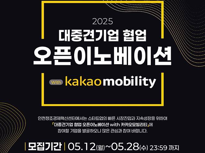 카카오모빌리티와 인천창조경제혁신센터(인천혁신센터)는 '대중견기업 협업 오픈이노베이션 with 카카오모빌리티' 프로그램에 참가할 스타트업을 오는 28일까지 모집한다고 13일 밝혔다.