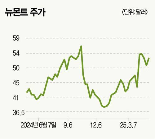 이에 뉴몬트 목표주가 상향 릴레이가 이어진다. 미국 리서치 기업 아구스는 뉴몬트 목표가를 기존 48달러에서 63달러로 높였다. BMO캐피탈마켓도 최근 64달러를 목표가로 제시했다. 스콧 브라운 레이먼드제이스 시장전략가 역시 63달러에서 66달러로 목표가를 상향 조정했다. 일각에선 “금값 상승세를 고려하면 이마저도 낮은 수준”이라는 의견도 나온다. 미국 유명 경제학자이자 대표적인 금 옹호론자인 피터 쉬프는 자신의 소셜미디어 계정에서 “UBS는 올해 금값이 3500달러 이상으로 갈 것이라고 전망하는데, 이를 고려하면 뉴몬트 목표가는 100달러를 넘어야 한다”고 강조했다.