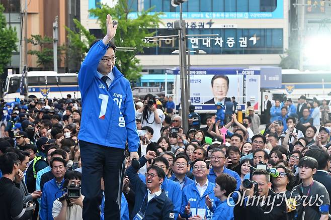 | ▲ 김경수 더불어민주당 총괄선대위원장이 13일 울산 남구 롯데백화점 광장에서 열린 울산 집중유세에서 이재명 후보에 대한 지지를 호소하고 있다. |