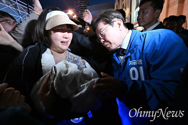 | ▲ 이재명 더불어민주당 대선 후보가 13일 울산 남구 롯데백화점 광장에서 열린 울산 집중유세를 마친 후 신생아를 안은 시민과 인사를 나누고 있다. |
