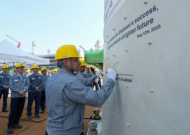 모하메드 알 카타니 아람코 다운스트림 사장이 지난 12일 에쓰오일 울산공장에서 추진하는 ‘샤힌 프로젝트’ 현장을 방문해 안전 시공과 성공을 기원하며 설비에 서명하고 있다. 샤힌 프로젝트는 9조2000억원을 들여 ‘스팀 크래커(기초유분 생산설비)’ 등 석유화학 생산설비를 구축하는 사업으로, 아람코의 한국 투자 가운데 사상 최대 규모다.