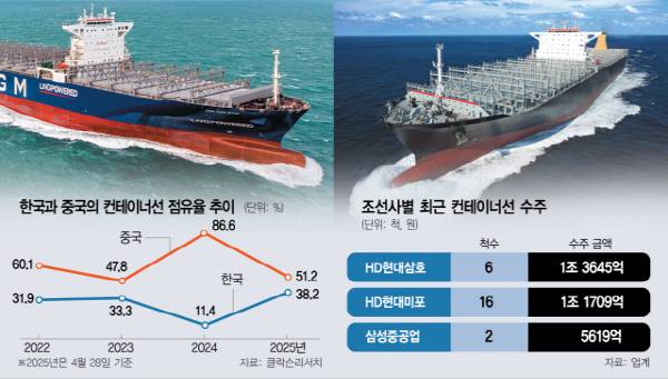 이미 지난달 HD한국조선해양은 컨테이너선 22척 2조5354억 원에 달하는 수주 잭팟을 터뜨렸다. 그동안 컨테이너선 분야는 저가 공세 탓에 중국 시장 점유율이 압도적이었다.