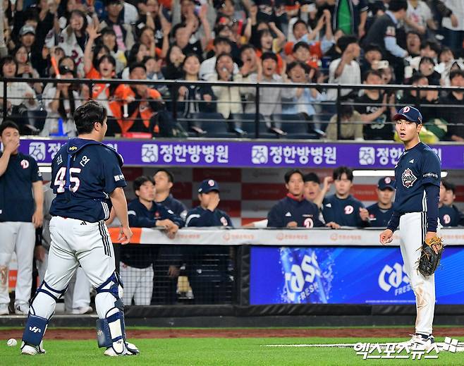 (엑스포츠뉴스 대전, 김한준 기자) 13일 오후 대전 한화생명 볼파크에서 열린 '2025 신한 SOL Bank KBO리그' 두산 베어스와 한화 이글스의 경기, 9회말 2사 2루 두산 김기연과 임종성이 서로 미루다 파울 타구를 놓치고 있다.