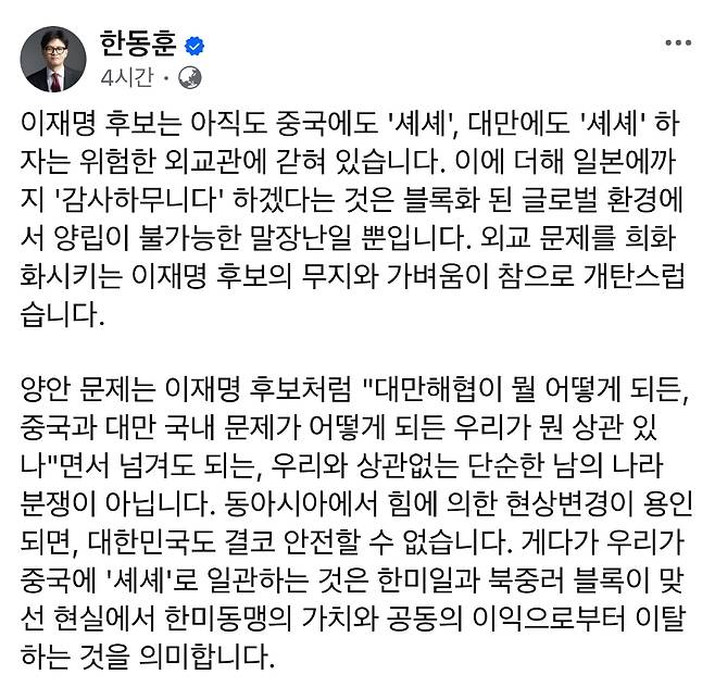 한 전 대표는 이날 자신의 페이스북을 통해 “이재명 후보는 여전히 중국에도 셰셰, 대만에도 셰셰 하자는 위험한 외교관에 갇혀 있다”고 지적했습니다.