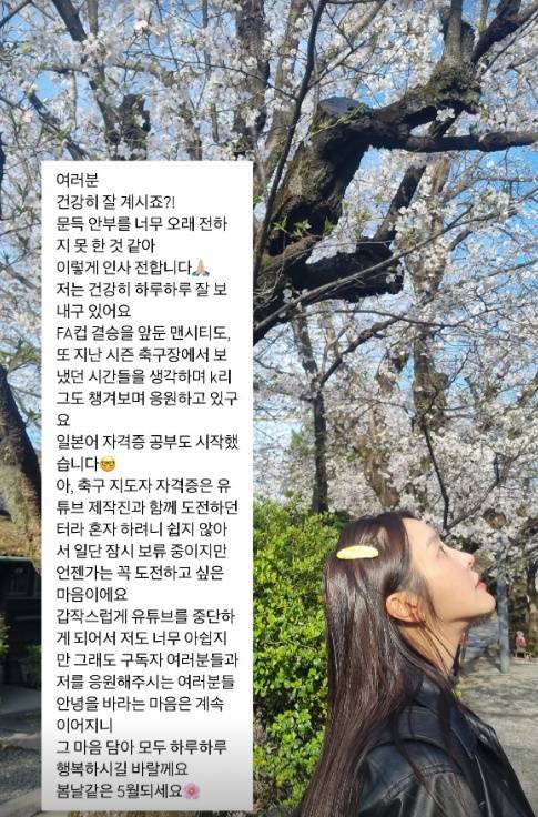이에 "갑작스럽게 유튜브를 중단하게 돼서 저도 너무 아쉽지만, 그래도 구독자 여러분들과 저를 응원해주시는 여러분들 안녕을 바라는 마음은 계속 이어지니 그 마음 담아 모두 하루하루 행복하시길 바라겠다"라며 "봄날 같은 5월 되시라"라고 덧붙였다.