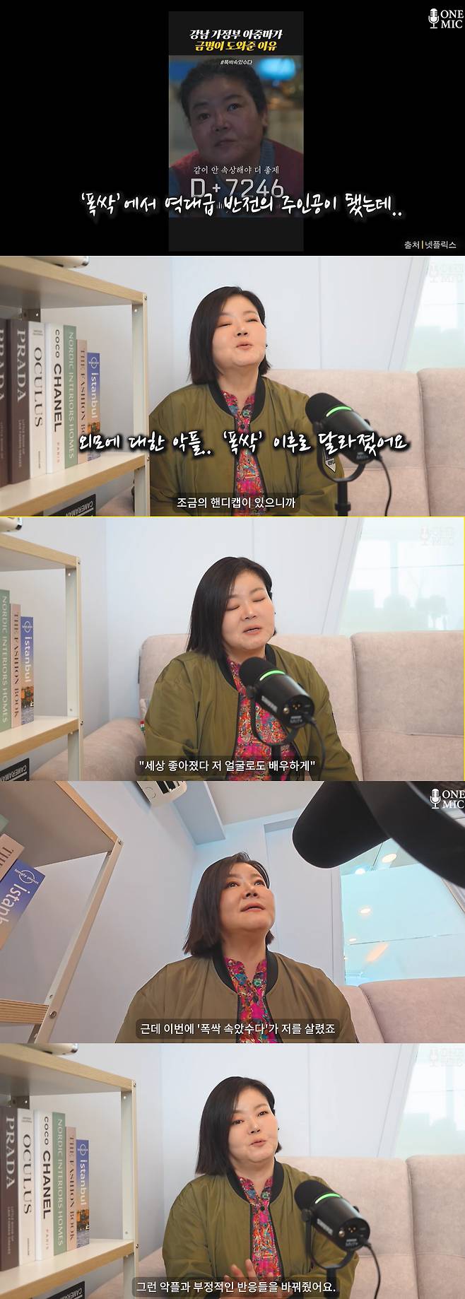 이어 "그동안 제 외모에 대한 악플 핸디캡이 있었다. 얼굴 비대칭이 있기 때문"이라며 "예전에 악플에는 '세상 좋아졌다. 저런 얼굴도 배우하게'라는 말도 많았고 남몰래 울기도 했는데 '폭싹'은 악플을 호평으로 바꿔줬다"고 웃었다.