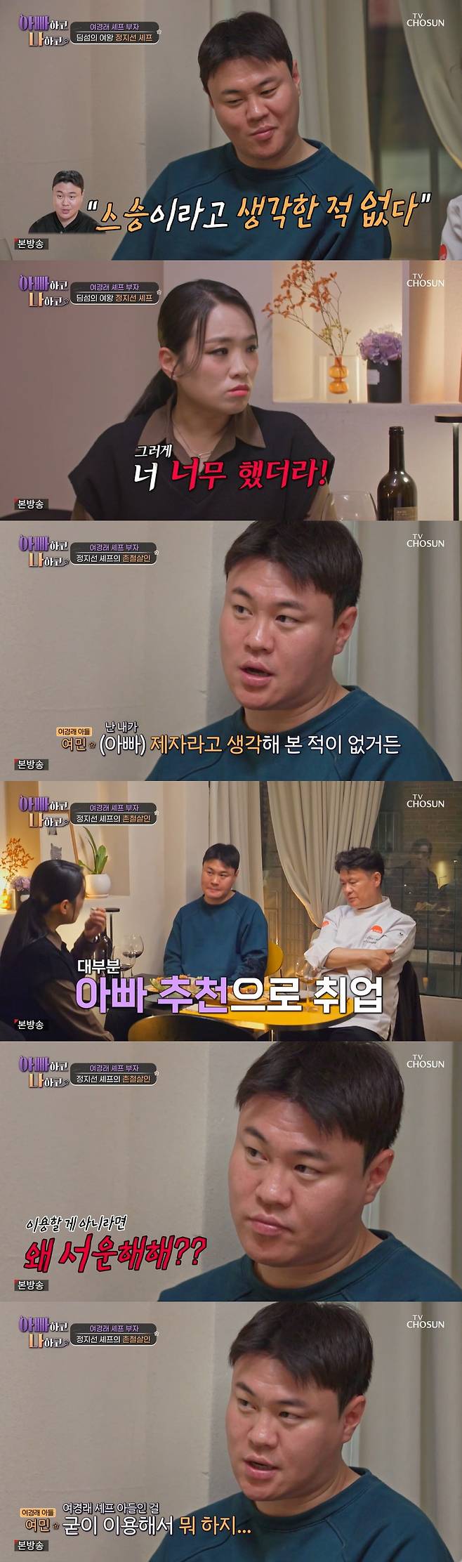 그러자 정지선은 "스승 떠나서 다른 데서 일 해봤냐"며 대부분 아버지의 추천으로 취업을 한 여민을 언급했고, 여민은 "아버지기도 하고 직장 상사기도 하다"며 "(여경래의 아들인걸) 거의 말한 적 없다. '굳이 이용해서 뭐 하지' 이런 거"라고 답했다.