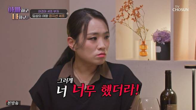 정지선은 "근데 그걸 왜 서운해하고, 가만히 앉아서 왜 다 해주길 바라냐. 꿈이 있으면 이용해야지. 그랬으면 서운함이 없다"며 일침을 가했고, 스튜디오에 있던 전현무가 "아빠가 해준 말 다 하고 있죠"라고 하자 여경래는 "그러니까요"라며 동의하는 모습을 보였다.