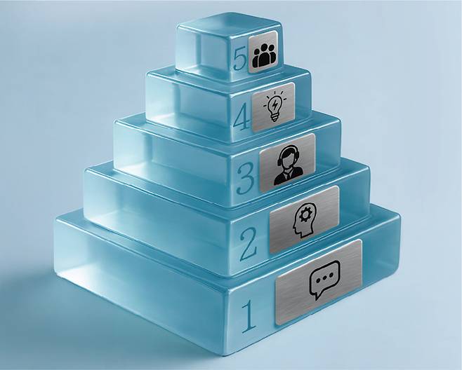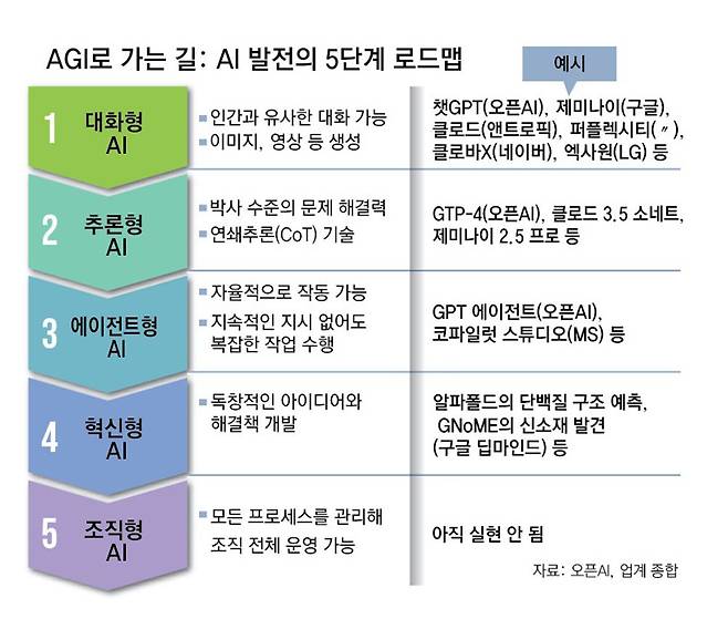 AI는 어떤 방향으로 고도화될까. 지난해 7월 블룸버그통신에 따르면 오픈AI는 AGI로 가는 AI의 진화 과정을 5단계로 구분했다. 이는 단순히 기술 이정표에 그치지 않고 AI가 인간의 사고와 역할에 어느 수준까지 도달할 수 있는지 보여주는 일종의 지형도다. 또 각 단계는 이에 따라 우리 사회와 경제가 어떻게 변화할지 예측하는 데 중요한 단서를 제공한다.