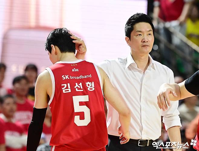타마요를 원천 봉쇄한 SK다. 전 감독은 "선수들이 잘했다. 포인트를 잘 잡는다. 잘 이겨준다. 비시즌 때 훈련하고 수비했던 수비 방식이다. 역동작에 걸리지 않게 같이 튀어 나가야 한다고 말하는데 타마요가 들어오면 중간에 서있어야 했다. 1~3차전은 그게 약했고 4~5차전에 됐다. 집중력이다. 저희는 항상 똑같은 주문을 하는데 선수들이 잘 움직여준다. 나도 게임 때 놓치는 게 많아서 영상을 보면 좋은 모습이 많았다. 처음에 허용한 게 있었지만, 수비 형태를 정말 잘 잡았다"라고 말했다.