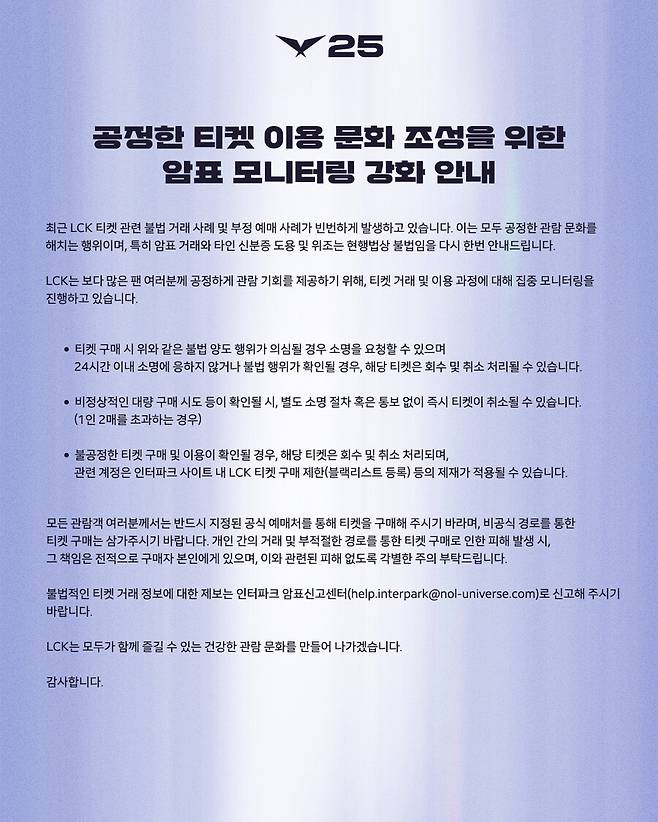 최근 LCK 티켓과 관련한 불법 거래 및 암표 사례가 반복적으로 발생하자 라이엇게임즈가 LCK의 공정한 티켓 이용 문화 정착을 위해 강력한 조치를 예고했다.