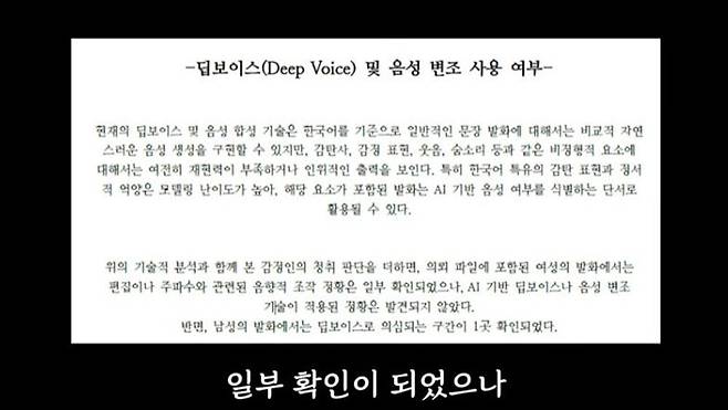 또한 일부 구간에서는 음성 변조 또는 AI 기반 음성 사용의 정황도 포착돼 해당 구간에서 인위적인 음성 변조가 개입되었을 가능성 역시 높은 것으로 평가됐다.