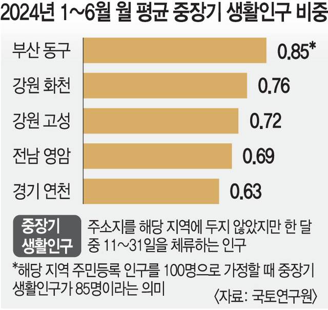 연구 결과 중장기 체류(한 달에 11~31일 해당 지역에 체류) 기준 주민등록 인구 대비 주소지가 해당 지역이 아닌 생활인구 비중이 가장 높은 곳은 부산 동구(0.85)였다. 이는 부산 동구의 주민등록인구를 100명이라고 할 때 그 지역에 주소지를 두지 않은 생활인구가 85명 수준에 이른다는 의미다. 강원 화천(0.76) 강원 고성(0.72) 전남 영암(0.69) 등이 그 뒤를 이었다. 전국 인구감소지역 89곳에서 주민등록 인구 대비 주소지를 해당 지역에 두지 않은 생활인구 비중 평균은 33%였다.