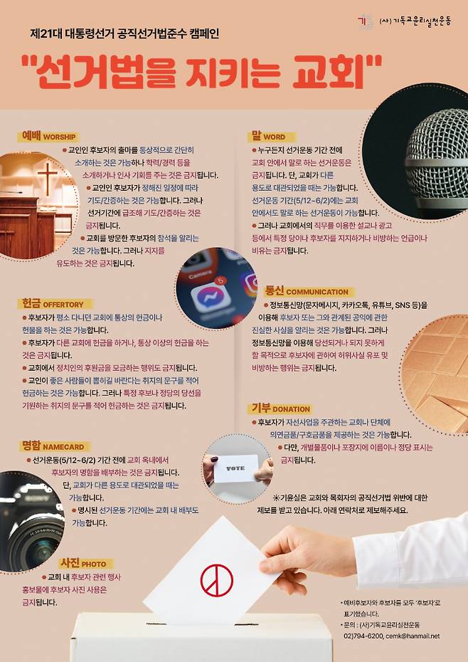 기윤실은 "교회가 지켜야할 공적선거법을 알기 쉽게 정리한 자료와 포스터를 교회에 제공하고 주일 예배와 설교, 광고를 모니터링 해 선거법 준수 여부를 확인할 계획"이라며 한국교회의 동참을 당부했습니다.