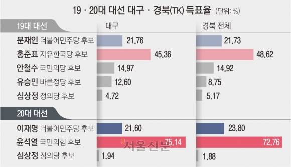 TK 지역은 ‘보수 텃밭’, ‘보수의 심장’으로 불리는 곳이다. 이번 대선에 출마한 이재명 후보와 김 후보는 각각 경북 안동과 영천 태생이고, 이준석 후보는 서울에서 태어났지만 등록기준지는 아버지의 고향인 대구로 돼 있다. 민주당과 개혁신당 등이 TK 민심 변화를 기대하는 이유 중 하나다.