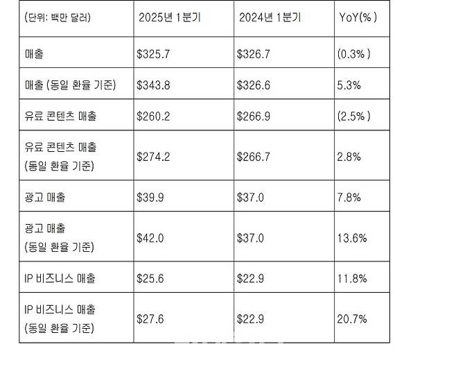 [이데일리 김아름 기자] 미국에 상장된 네이버웹툰의 모회사 웹툰 엔터테인먼트가 올해 1분기 동일 환율 기준 매출이 전년 동기 대비 5.3% 증가해 3억 2571만 달러를 기록했다고 14일 밝혔다. 원화 및 엔화 동반 약세로 인해 달러 기준 매출 성장세는 약화됐으나, 지난해 1분기와 동일한 환율을 적용하면 매출은 전년 동기 대비 1720만 달러 증가한 3억 4380만 달러를 기록했다.