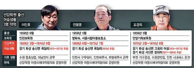 세 사람은 다 선감학원 출신이다. 어린 시절 경기도가 운영하는 외딴섬 선감도의 아동수용시설에 갇혀 강제노역과 굶주림, 매질, 성폭행을 견뎌냈다. 이씨는 6년6개월, 전씨는 5년, 조씨는 4년6개월간 선감학원에 있었다. 1960년대 말부터 1970년대 중반까지의 일이다. 이들은 서울시립아동보호소 또는 보육원을 통해 선감학원으로 흘러왔다. 부모의 얼굴은 모른다. 이름과 생일도 시설에서 정해줬다. 이들의 또 다른 공통점은 10대 중후반 나이에 선감학원에서 나와 농어촌 가정집으로 갔다는 것이다. 입양이라도 됐던 것일까, 자립 생활을 한 것일까. 아니다. 그들은 ‘머슴’이었다.