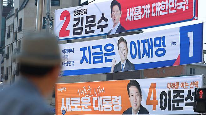 ▲ 더불어민주당 이재명 후보, 국민의힘 김문수 후보, 개혁신당 이준석 후보의 현수막