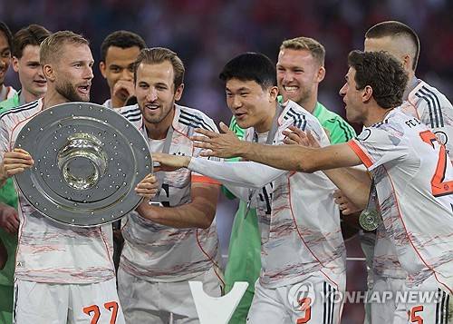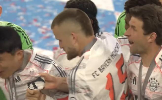 우승 메달을 목에 건 바이에른 뮌헨 선수들은 한데 모여 마이스터살레를 들어올렸는데, 선수단 뒤에 서 있던 김민재도 케인과 다이어, 그리고 바이에른 뮌헨의 레전드인 토마스 뮐러에게 등떠밀려 앞으로 나와 마이스터살레를 번쩍 들었다.
