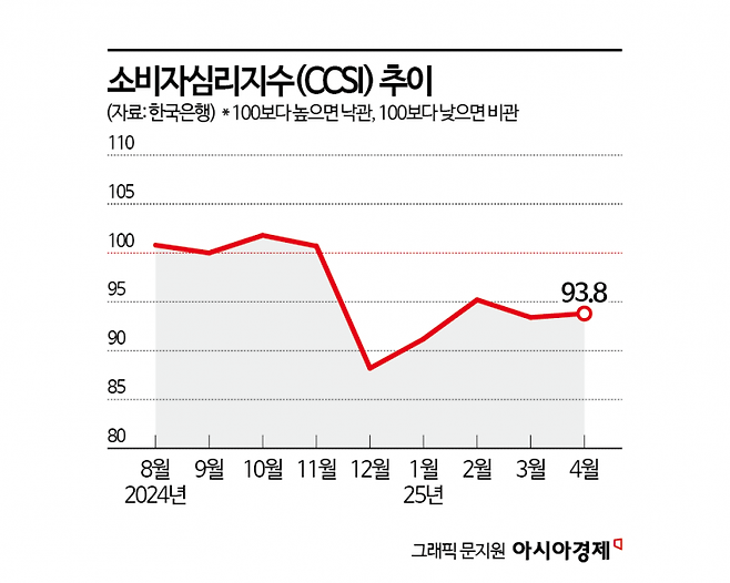 외국인 관광객이 늘어나는 것뿐만 아니라 내국인의 소비심리도 꿈틀대고 있다. 한국은행이 발표한 '2025년 4월 소비자동향조사 결과'에 따르면 이달 소비자심리지수(CCSI)는 93.8로 전월 대비 0.4포인트 올랐다. 지난해 12월 비상계엄 사태로 88.2까지 급락했던 소비심리가 조기 대선을 앞두고 정책 기대감이 커지며 점차 회복 중인 모양새다.