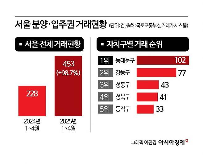 14일 국토교통부 실거래가 공개시스템에 따르면 올해 1~4월 서울에서 이뤄진 분양권·입주권 매매 건수는 총 453건으로 집계됐다. 지난해 같은 기간(228건) 대비 98.7% 증가한 수치다. 2023년 같은 기간엔 136건이었다. 매년 두 배 수준으로 가파르게 불어나고 있다. 부동산 거래 신고기한이 30일 이내임을 고려하면 실제 거래량은 더 늘어날 전망이다. 입주권은 재개발·재건축 조합원이 새 아파트에 입주할 수 있는 권리, 분양권은 일반인이 청약을 통해 새 아파트에 입주할 수 있는 권리를 각각 뜻한다.